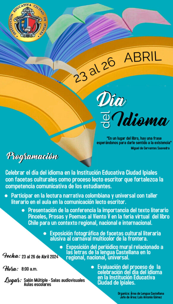 La Institución Educativa Ciudad de Ipiales y el Área de Lengua Castellana se complacen en celebrar esta ocasión maravillosa con una semana repleta de literatura, letras, arte y cine.